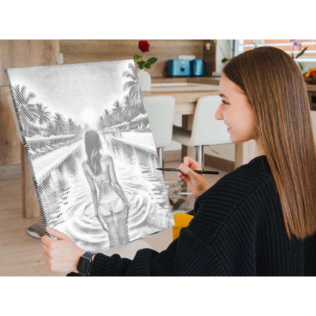 Ustvarite svojo novo umetniško sliko s pikami! Izberite flomaster v svoji najljubši barvi in po lastni presoji narišite pike na vnaprej natisnjeno platno. Če izberete okvirjeno različico, jo lahko takoj obesite na steno. Kljub temu, da nimate nobenih izkušenj s slikanjem, je impresivna umetniška vrednost končne slike zagotovljena. Pika za piko vas bo pripeljala do čudovitega umetniškega dela.